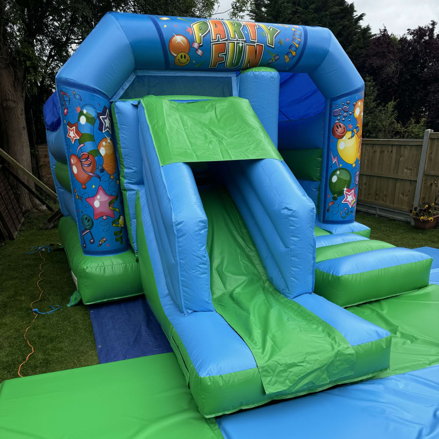 Double the fun with our Front Slide Combi Bouncy Castle! This green and blue inflatable combines a spacious bounce area with an integrated front-facing slide, all wrapped in a vibrant party theme. It’s the ideal centrepiece for any children's party or celebration.