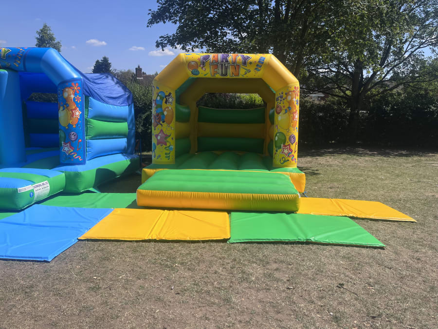 Both castles feature a vibrant Party Fun theme, adding colour, energy, and visual appeal to your celebration. These eye-catching inflatables keep children active and engaged throughout the event.